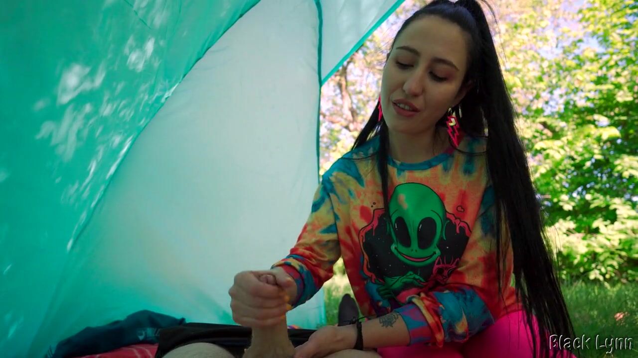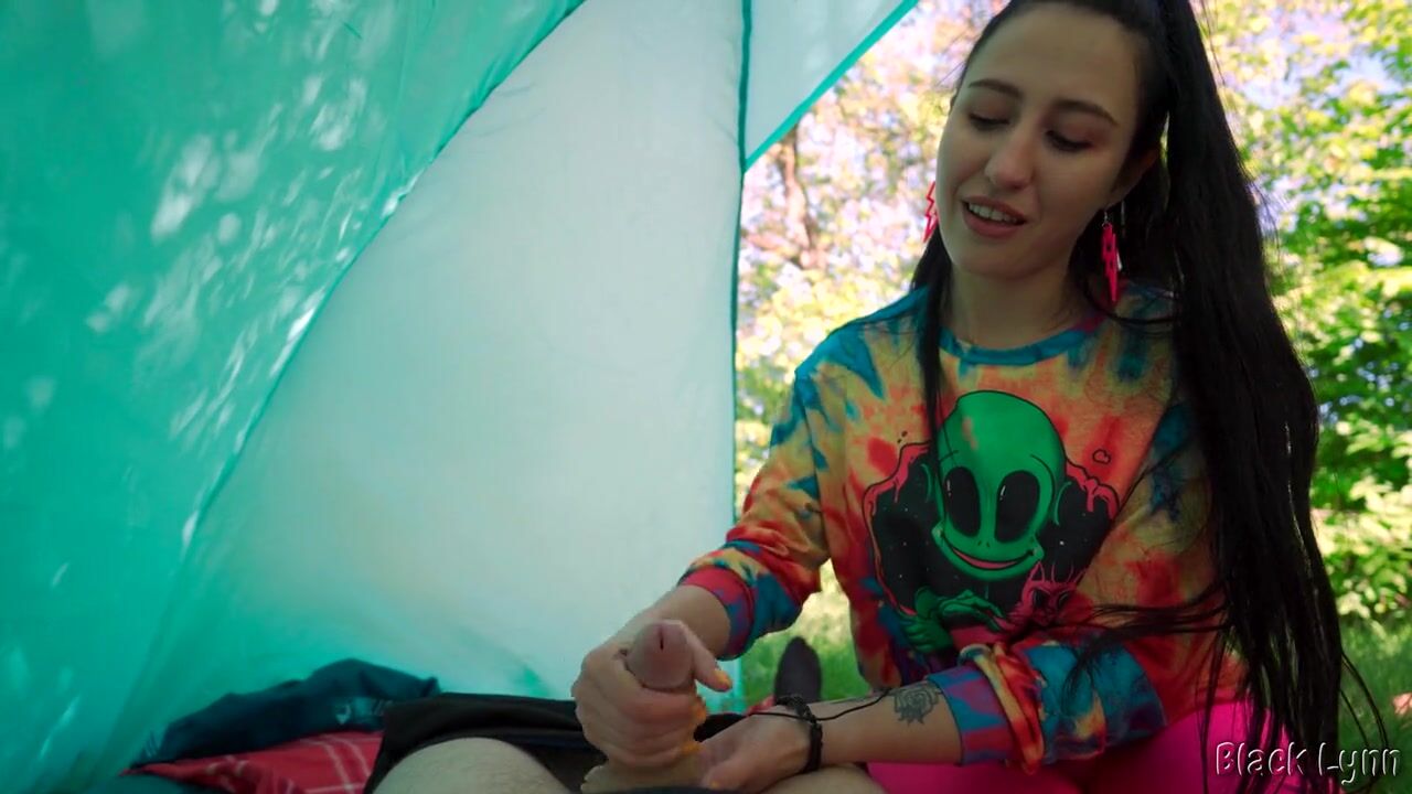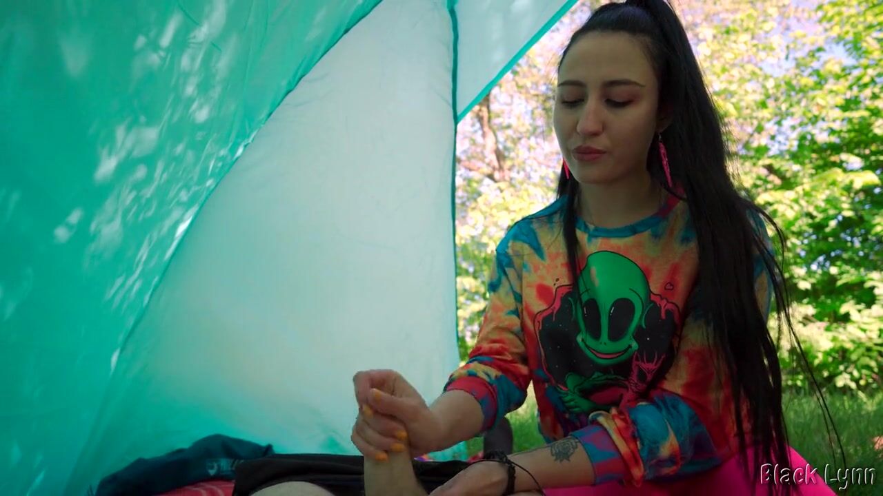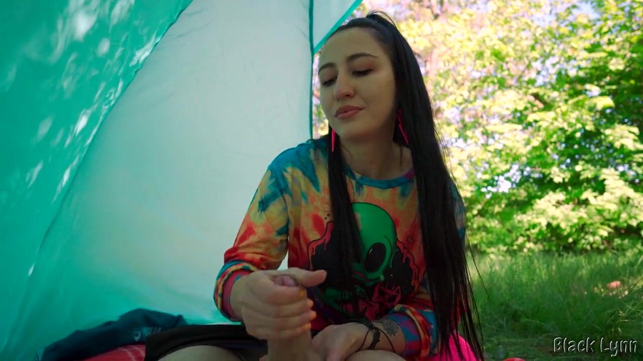 BRUNETTE HIPPIE JERKS ME OFF FOR FREE IN A TENT