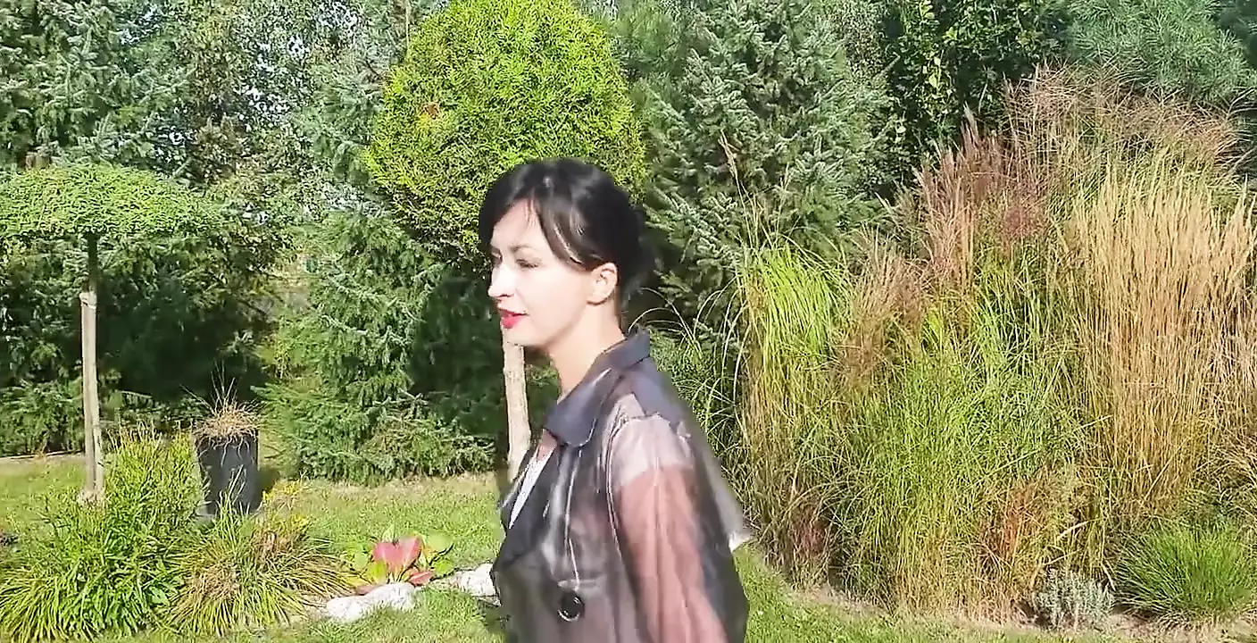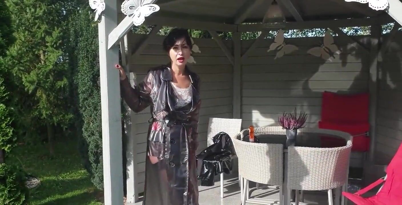 GARDEN, BEAUTIFUL SUNNY DAY. WANILIANNA IN TRANSPARENT RAINCOAT, BLACK SEAMED NYLONS