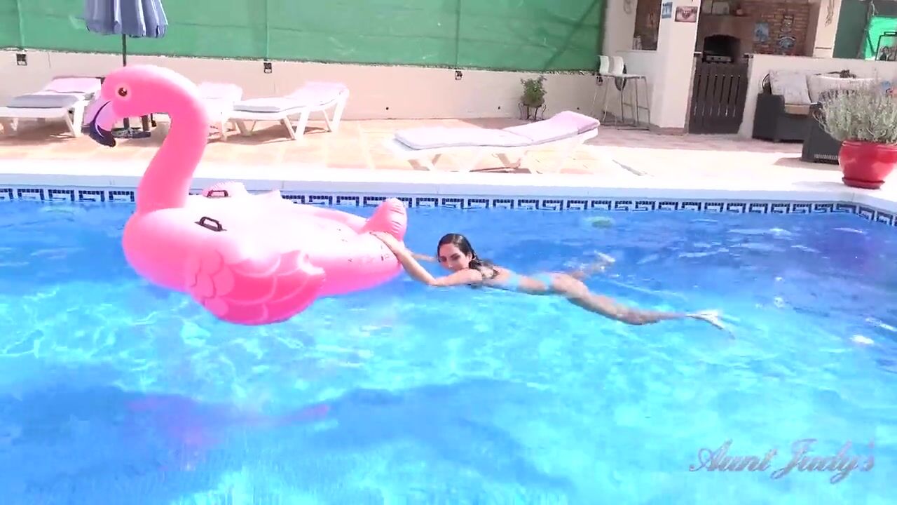 . Hot Spanish MILF Linda Del Sol gets horny playing in the swimming pool under the hot summer sun. She shows off her juicy latina ass, then slides out of her bikini and rubs her tight wet MILF pussy until she makes herself cum. Another gem from AuntJudy's Unrivaled Collection of Hot MILFs.
