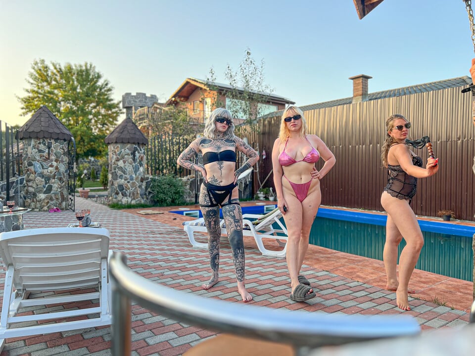 . It was a long day for slave K. My Canadian Guests torment him all day, and the evening is ahead of Us. Mistress Mercy Rage arrived from Vancouver and she is completely covered with tattoos. She have tongue bifurcation and real vampire teeths. Princess Mia arrived from Toronto and she is the ultimate busty Blonde Goddess with a gorgeous curvy body. I am the Queen of Dracula Femdom Castle, the worlds first BDSM Fortress and I take out this worm from one of the tower prison and drag him in the iron stock to my Castle`s pool area. My slave is shaking when hearing My heels - he knows he will be whipped. This time We will use my favourite full-leather flogger. We start by whipping his back and ass alternatively, leaving some very nice marks on the back. Since this slave's ass is more used to whipping and has a thicker skin, I decide at some point to whip him in the exact same spot, I know this will cause him great pain and I'm pleased to see it does. No matter what defenses a slave has, I ca