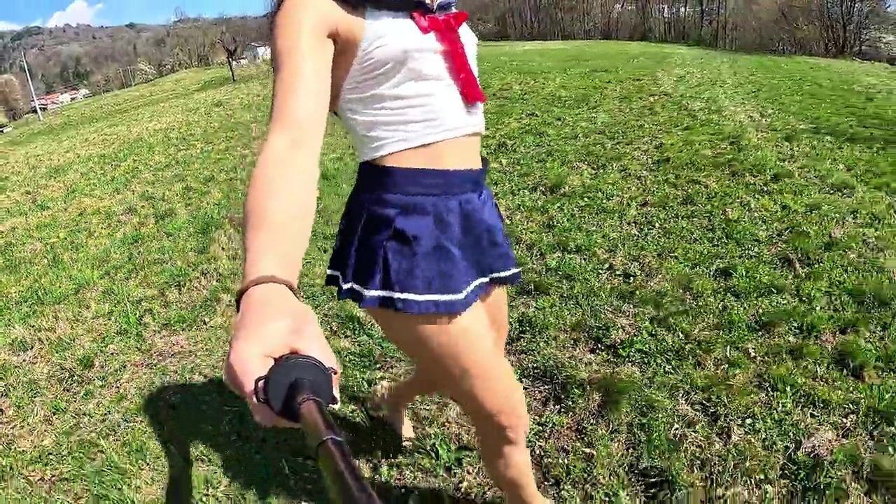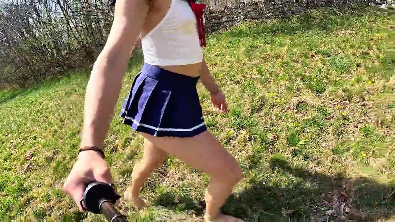. I walk into the country in my sexy schoolgirl outfit without panties, I show my beautiful ass and my perfect body. I am discovered by a gardener who stares at me and looks at my ass.