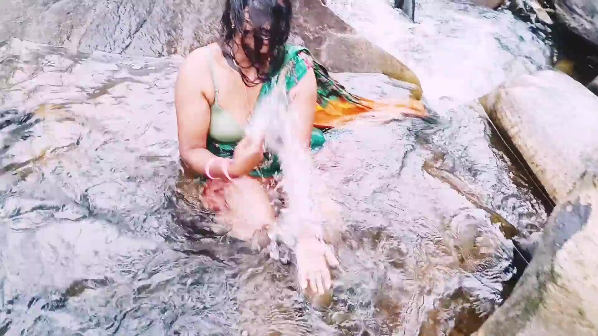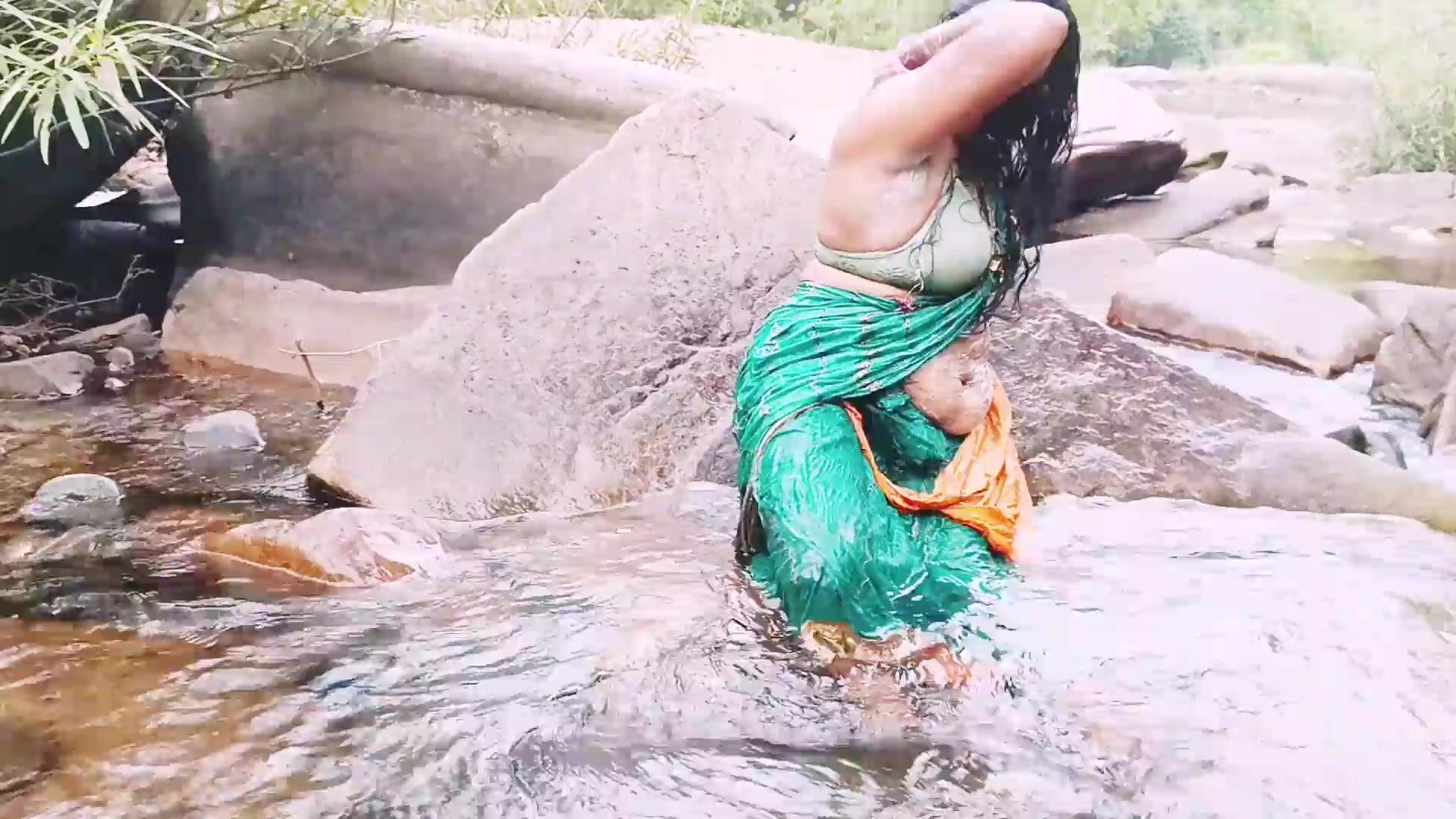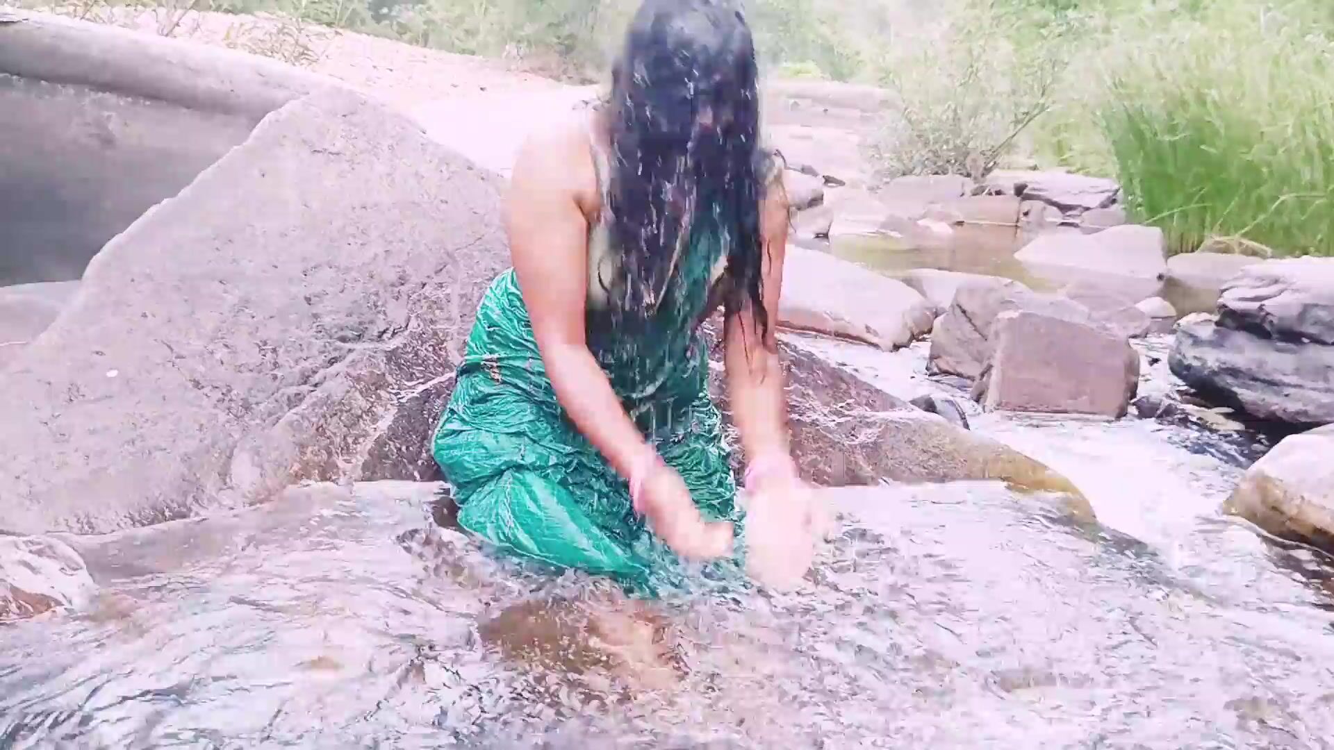 VILLEGE AUNTY OUTDOOR WATER FALL BATHING. TELUGU DIRTY TALKS.