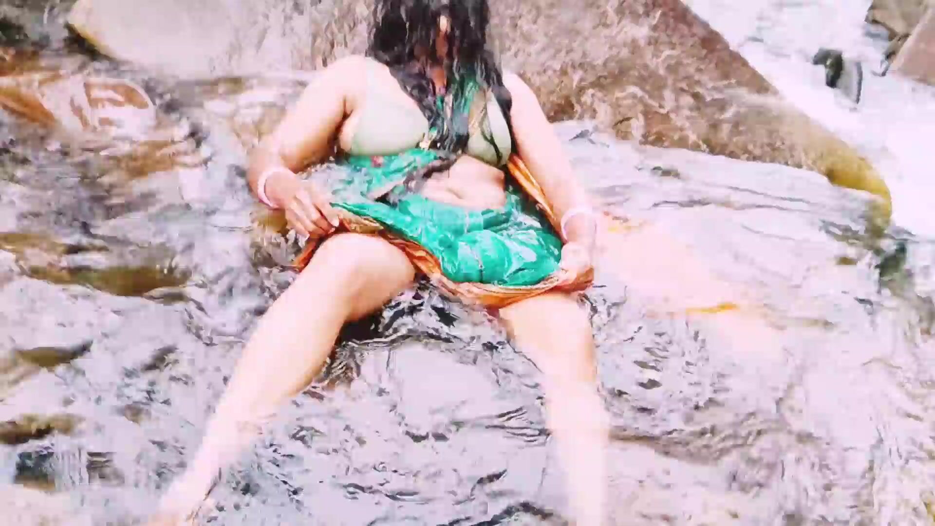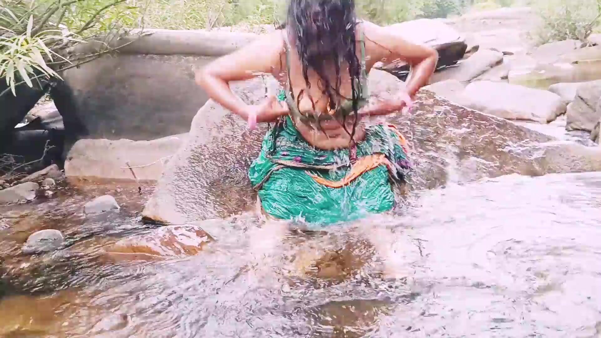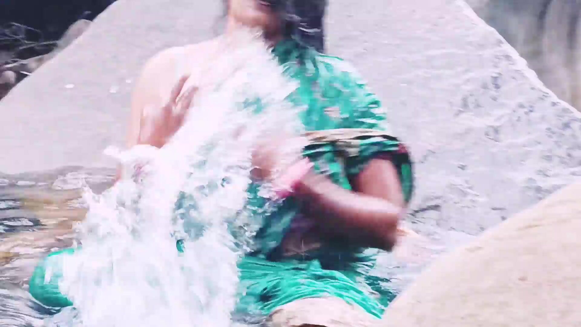 VILLEGE AUNTY OUTDOOR WATER FALL BATHING. TELUGU DIRTY TALKS.